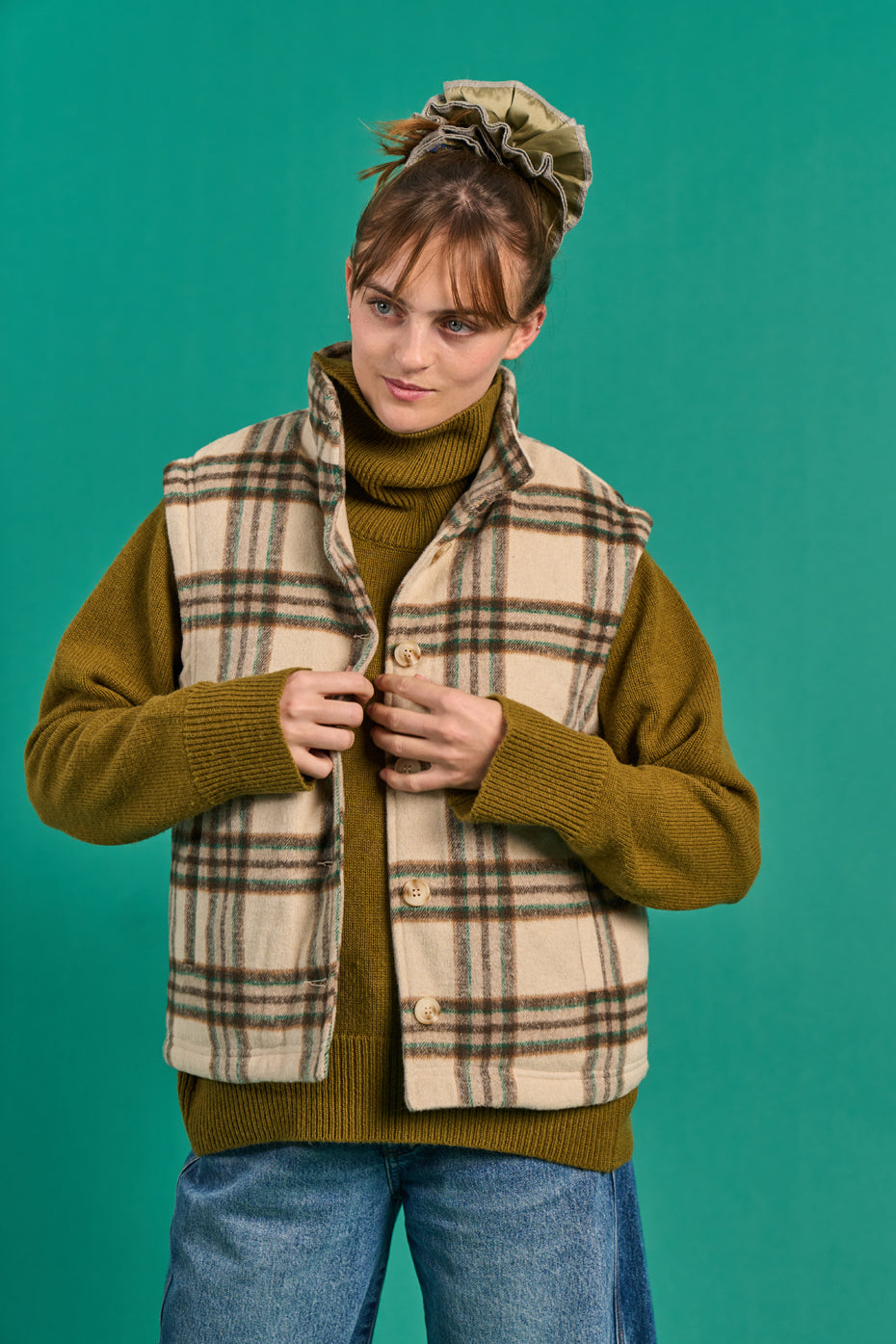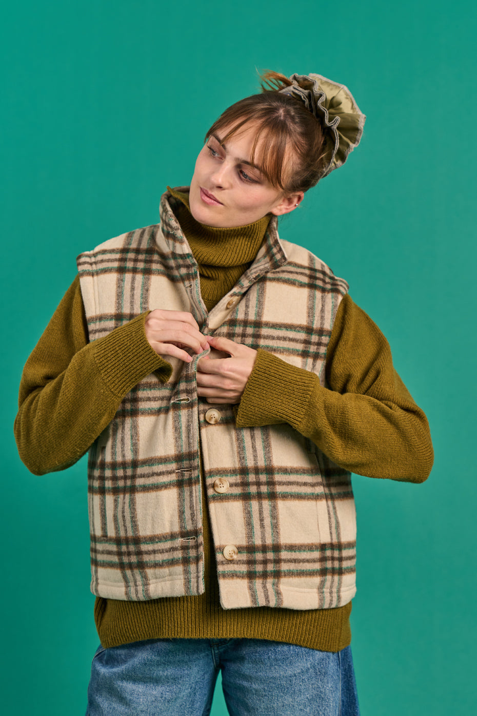 This sleeveless, slightly oversized sleeveless jacket is the key piece in your wardrobe, inspired by the 80s. Its vintage style is enhanced by its green checks, a button placket and a collar which give the piece even more character.