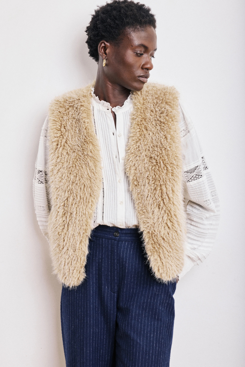 The Vobby sleeveless cardigan blends softness and character with its long-haired faux fur. An easy piece to layer over a shirt, light sweater or even a dress to warm up your looks in the blink of an eye.