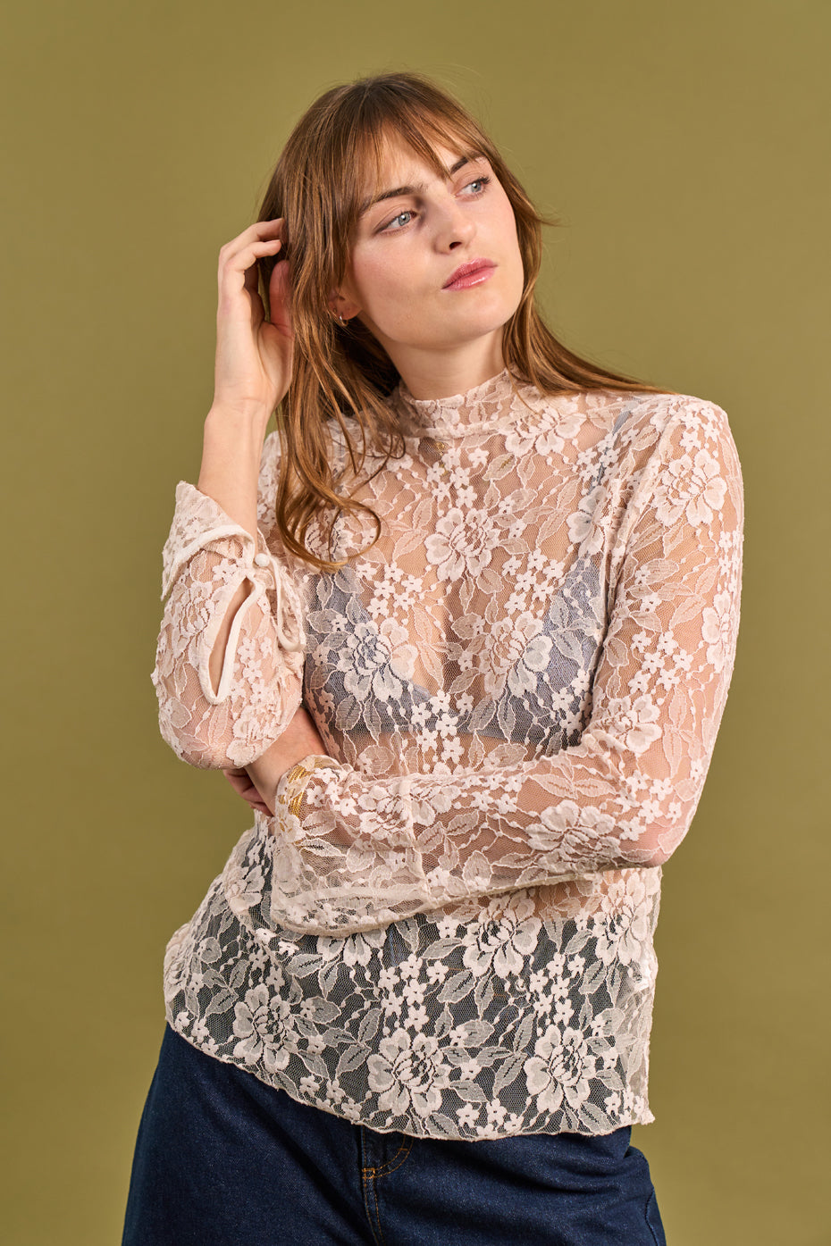 Elegance with a Touch of Charm, the Meena Blouse is sheer, made in the most beautiful floral lace. The long-sleeved blouse is slightly fitted and has button closure with keyhole opening at the back for a feminine silhouette. The high neck and slightly flared sleeves with buttons add some extra charm to the style. Style it with trousers and a top or bra underneath for an effortless look.