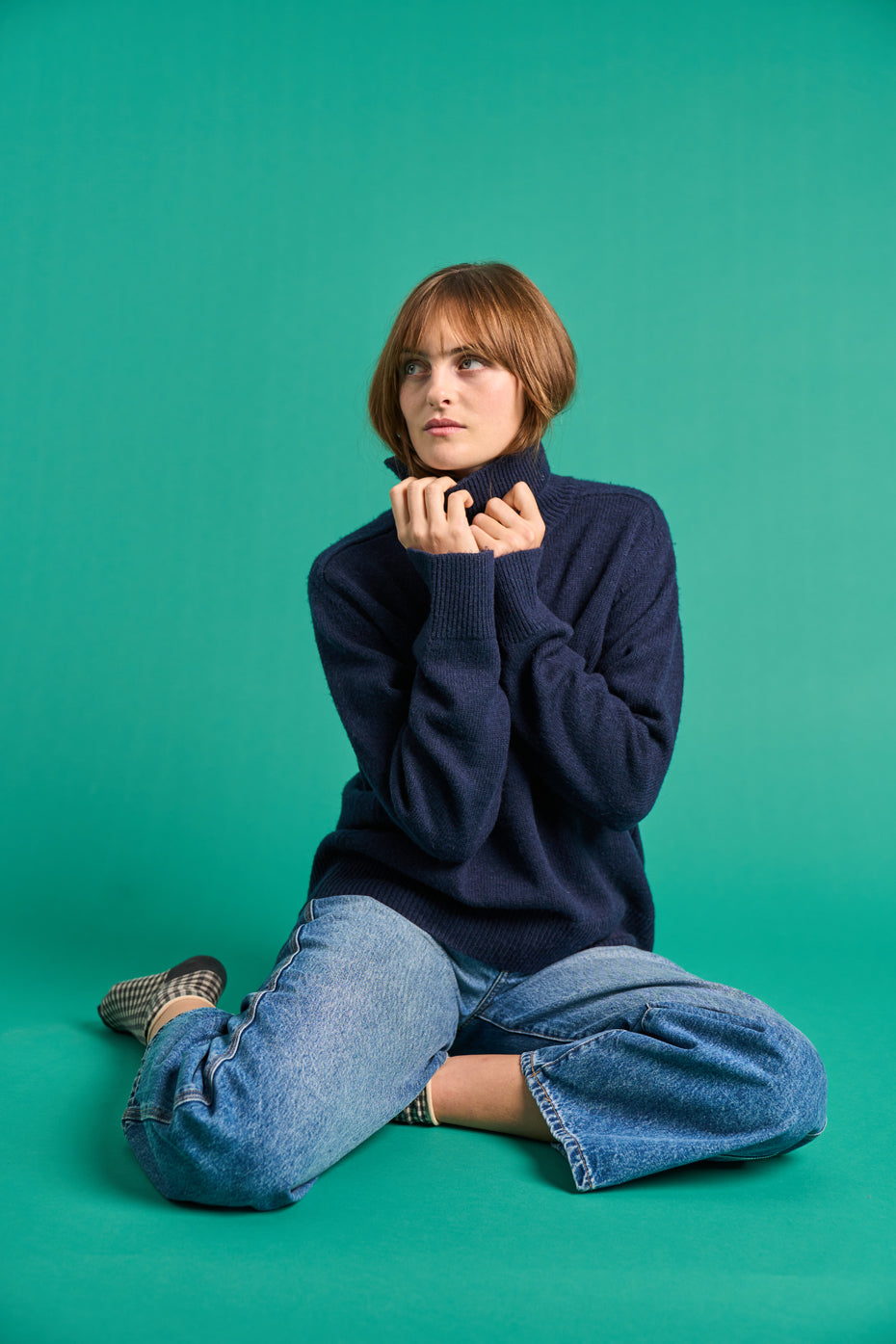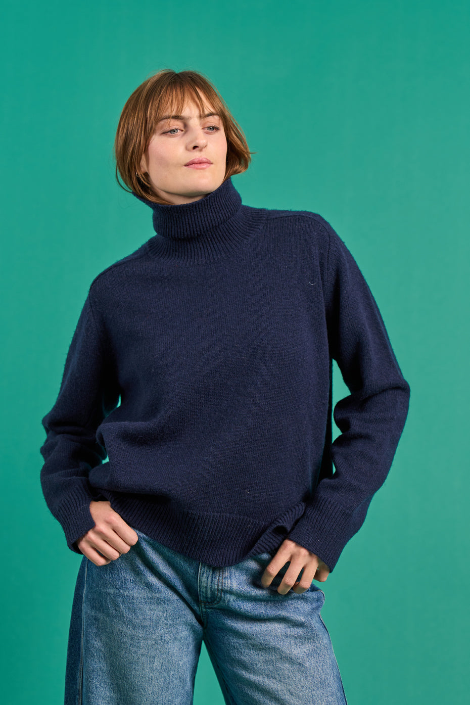 Soft wool knitted roll neck jumper by Rabens Saloner. This piece is defined by a relaxed shape, with ribbed edges and slits at the back of the turtleneck and on either cuff.