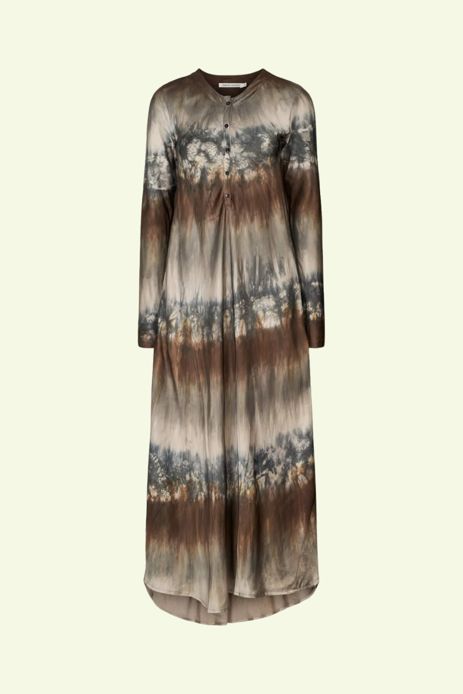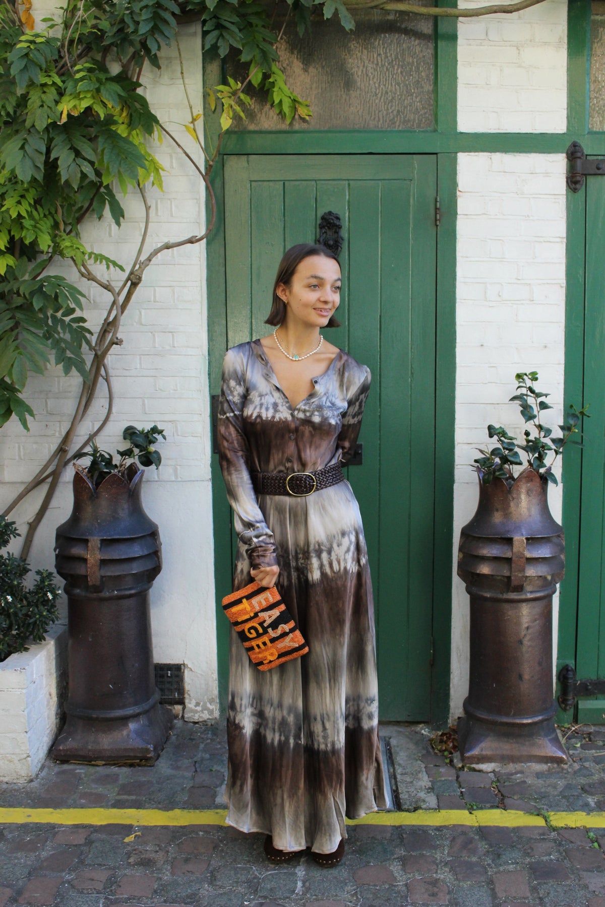 Produced in Indonesia, the dress features a long silhouette with front buttons and a flowing skirt. A perfect dress for both evening occasions and daytime looks.