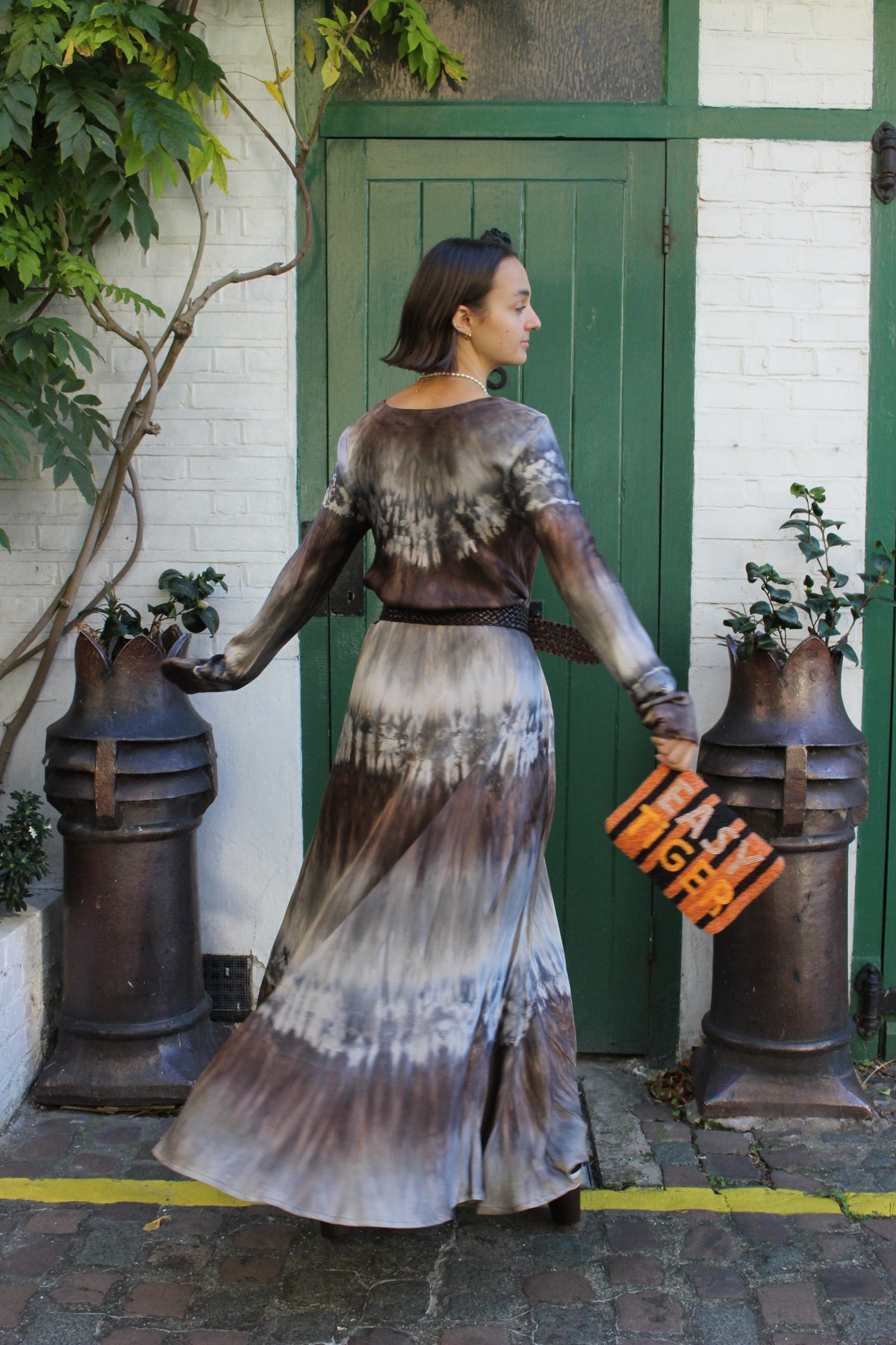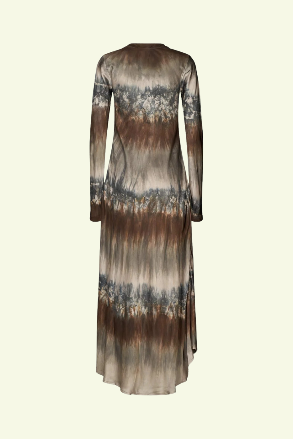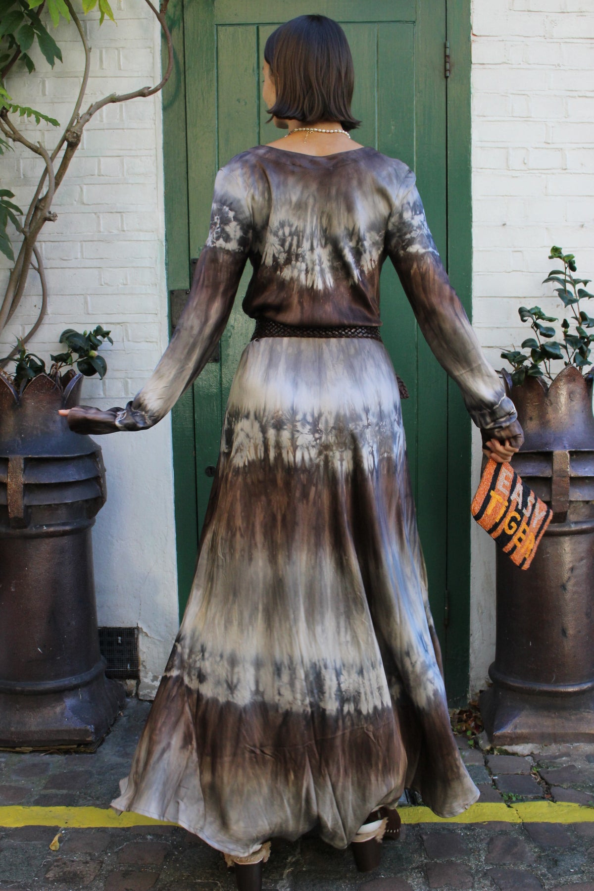 The Karin long sleeve bias dress carries a classic silhouette with an edgy print made by hand.