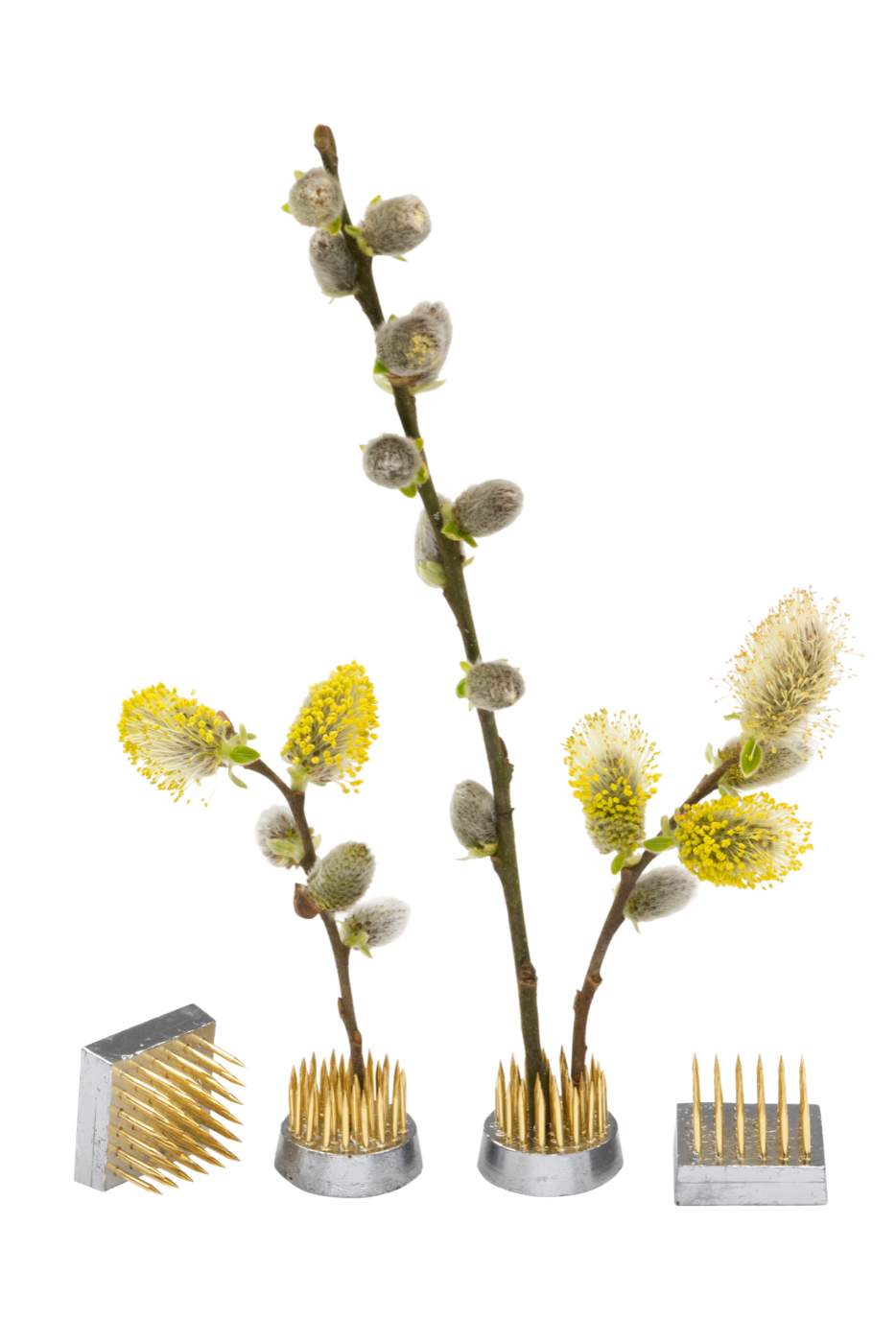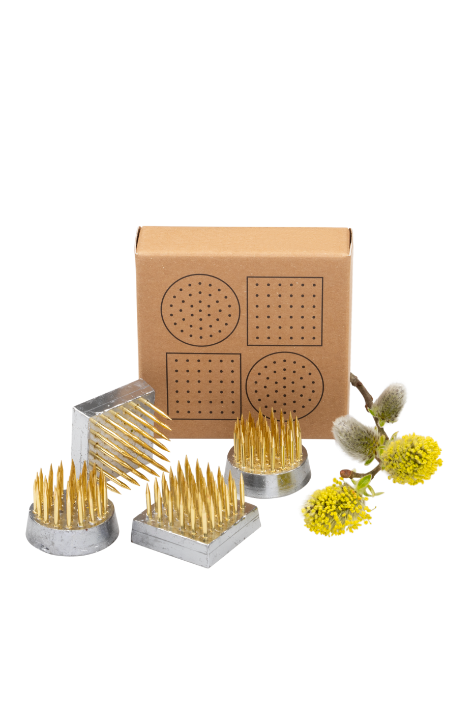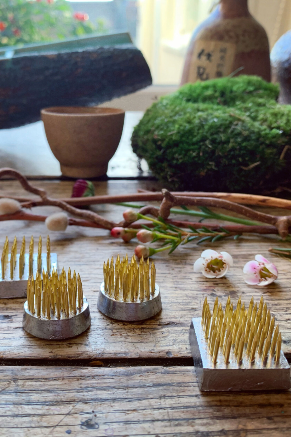 Used for ikebana flower displays, these Kenzan are becoming increasingly popular for western style flower arranging, doing away with foam completely. The brass pins are strong enough for woody material, as well as soft green and grass stems. #foamfree