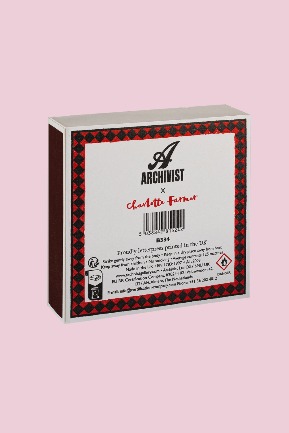 The Archivist Gallery signature square matchbox featuring a vibrant pink background with a black and white Staffordshire Figure and the words 'Simply Superior, Fireside Matches.'