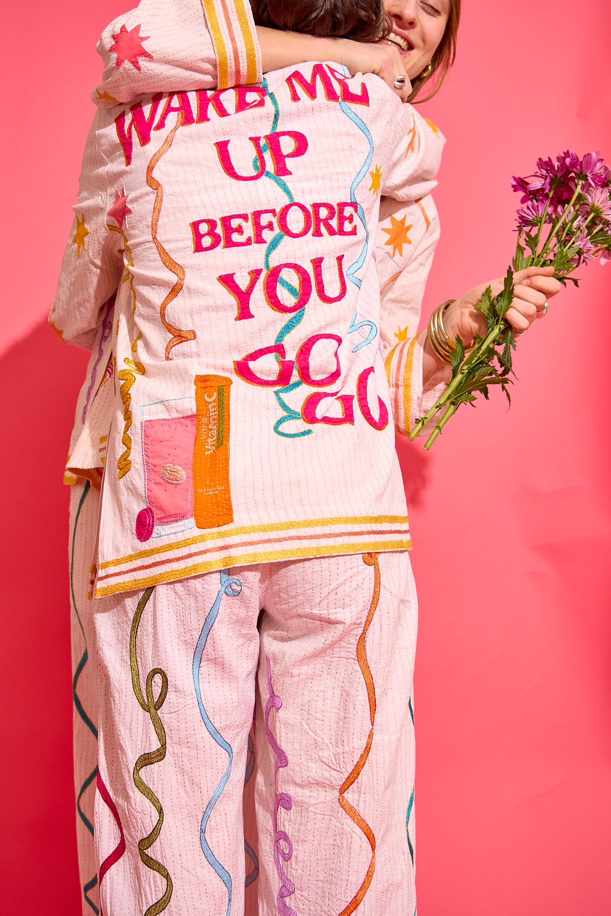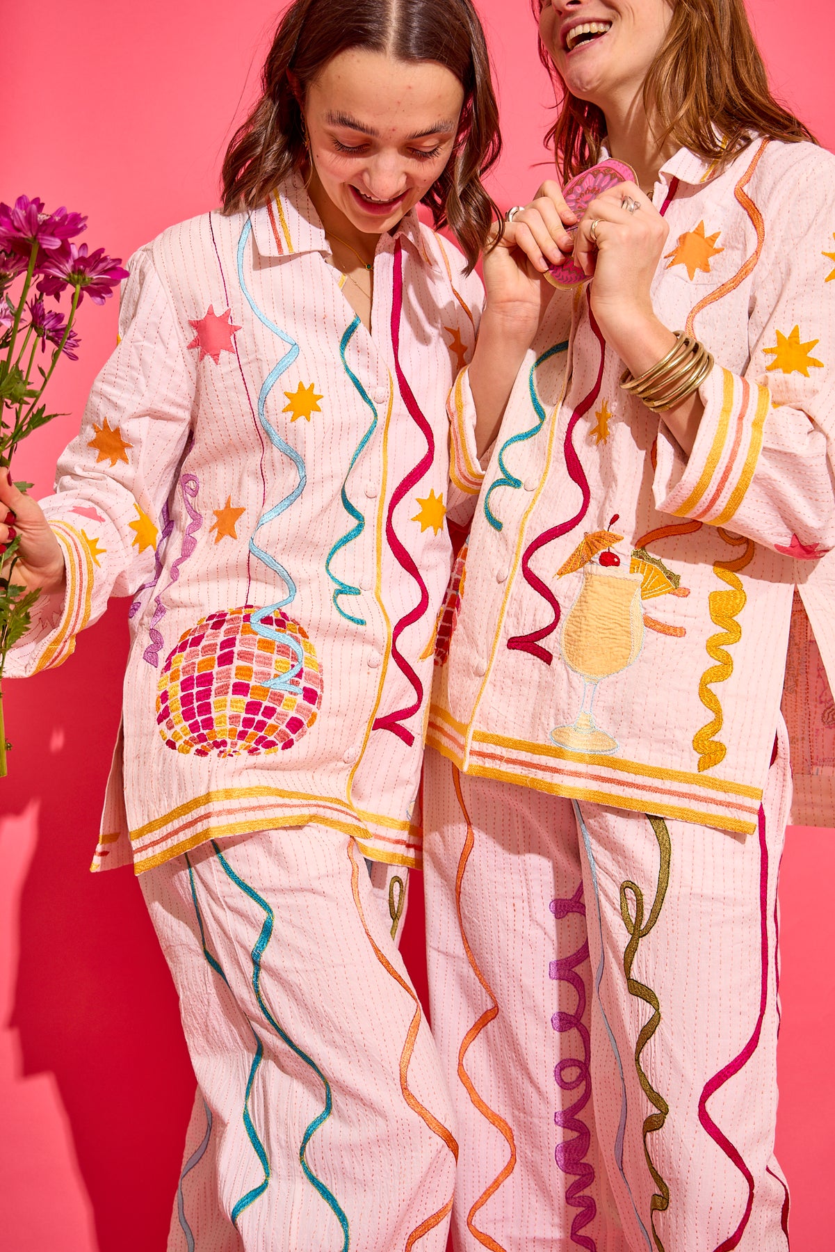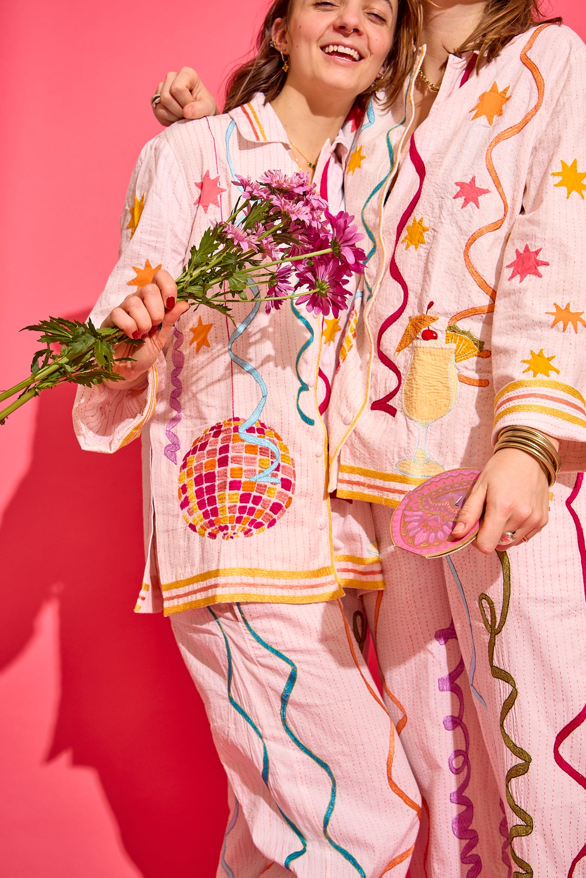 Welcome to absolute luxury! The Jacksons hand-embroidered party pyjamas are the ultimate festive loungewear. Designed in our Notting Hill studio, our talented artisans in Bangladesh then hand embroider colourful streamers, stars and disco balls onto raw, unbleached cotton pyjamas. These make for the perfect gift and are a statement piece to wear throughout the year.