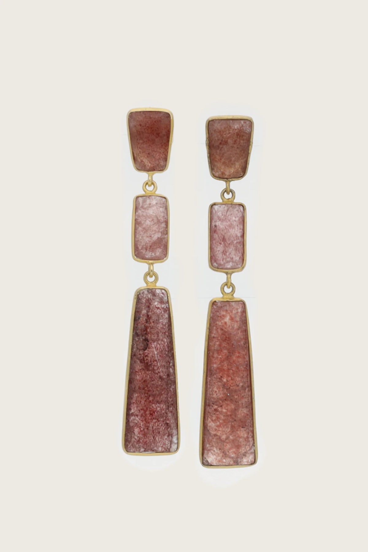 Crafted from brass with 18-karat gold inlay and sterling silver components, the Tota Earrings deliver understated luxury. Choose between strawberry quartz or labradorite, each precisely faceted across three distinct cuts—an 8mm × 11mm stone, a 10mm × 31mm radiant cut centrepiece, and a 6mm × 13mm baguette accent.