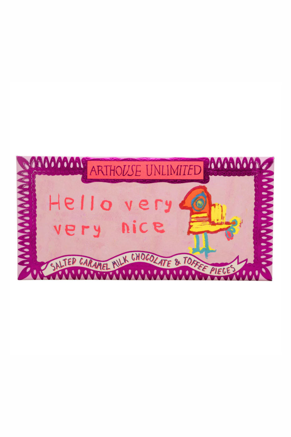 25g grams of pocket-sized deliciousness, presented in a recyclable paper envelope that features Karen Brown's bright and beautiful 'Hello, Very Very Nice' design and is finished with a shimmering pink foiled frame.