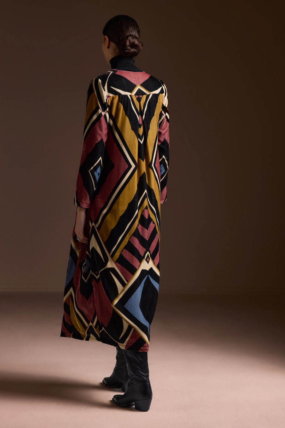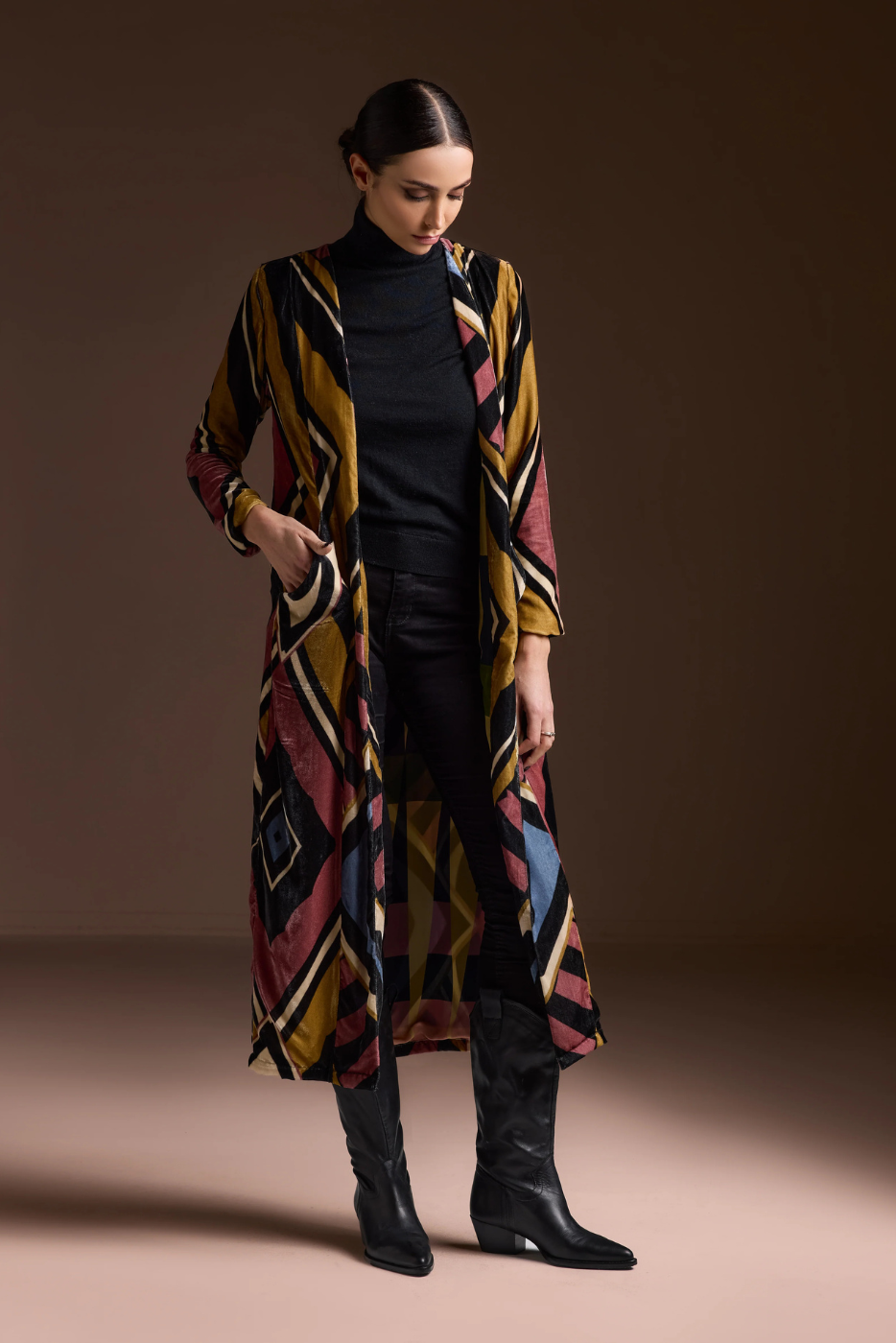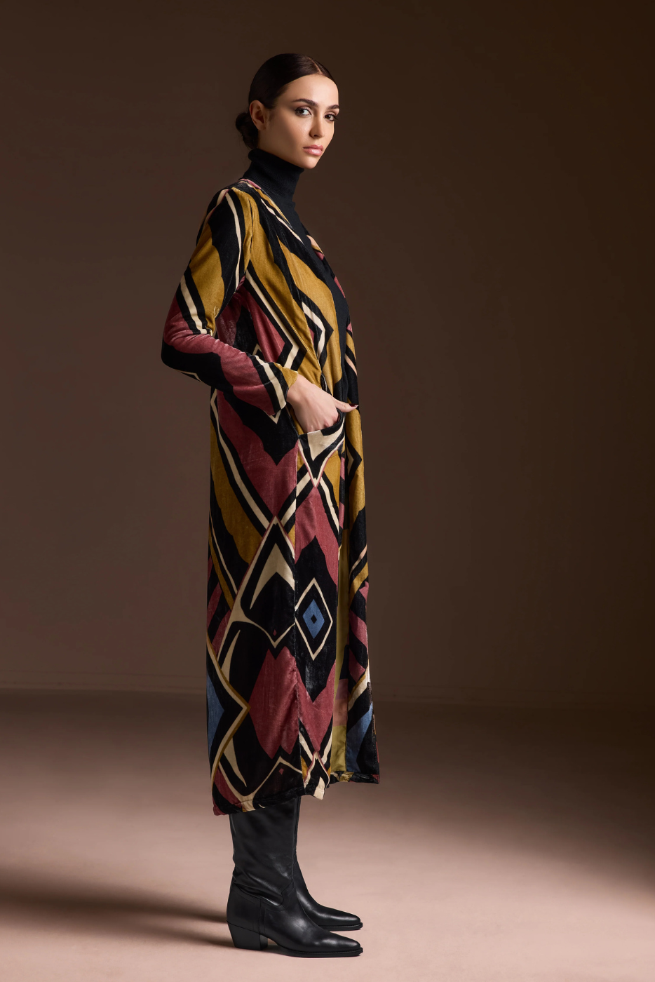A structured silk velvet coat lined in printed Volantis silk. The Shield Coat features a slim, tailored fit with pockets and clean lines — refined yet assertive, designed for mid-season days in the city.